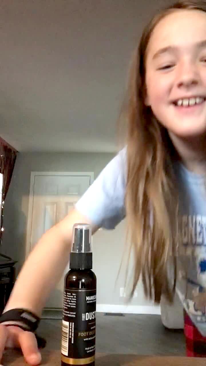 A young girl rides on a hoverboard, then she steps off of it as it spins in circles and it continues to spin uncontrollably in a living room.