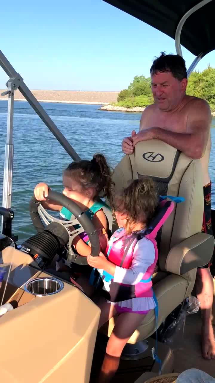 Three young girls ride on a raft tied to a boat on a lake, then they hit a bump and fly up in the air.