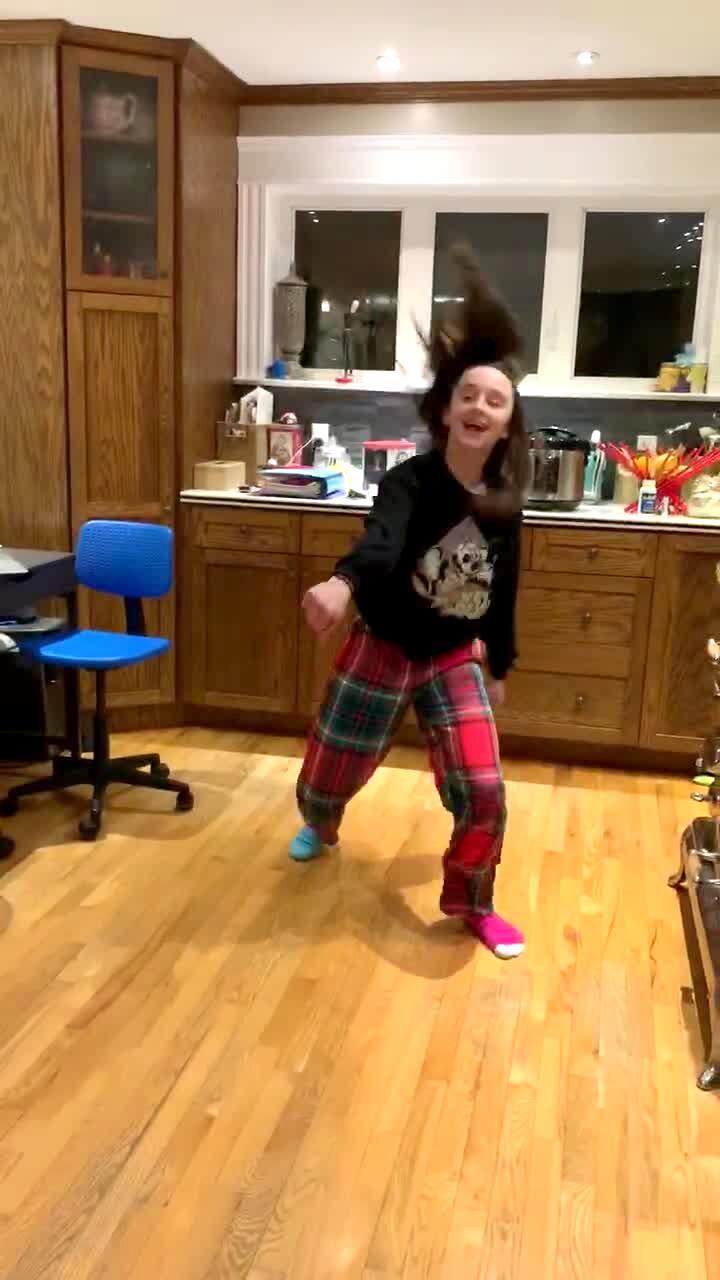 A young girl dances to music in the kitchen, then crashes into a chair and falls. Music rights not cleared.