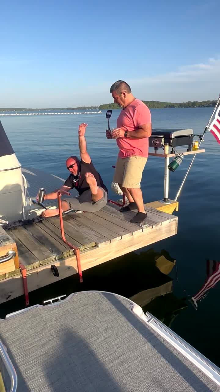 A man slips, as he tries to step onto a dock from a boat and falls backwards into a lake.