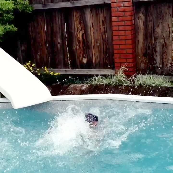 A young boy lies down in the shallow end of a swimming pool and slides into the deep end while it fills with water in a yard, then a man tries to follow him, but he falls on his stomach.