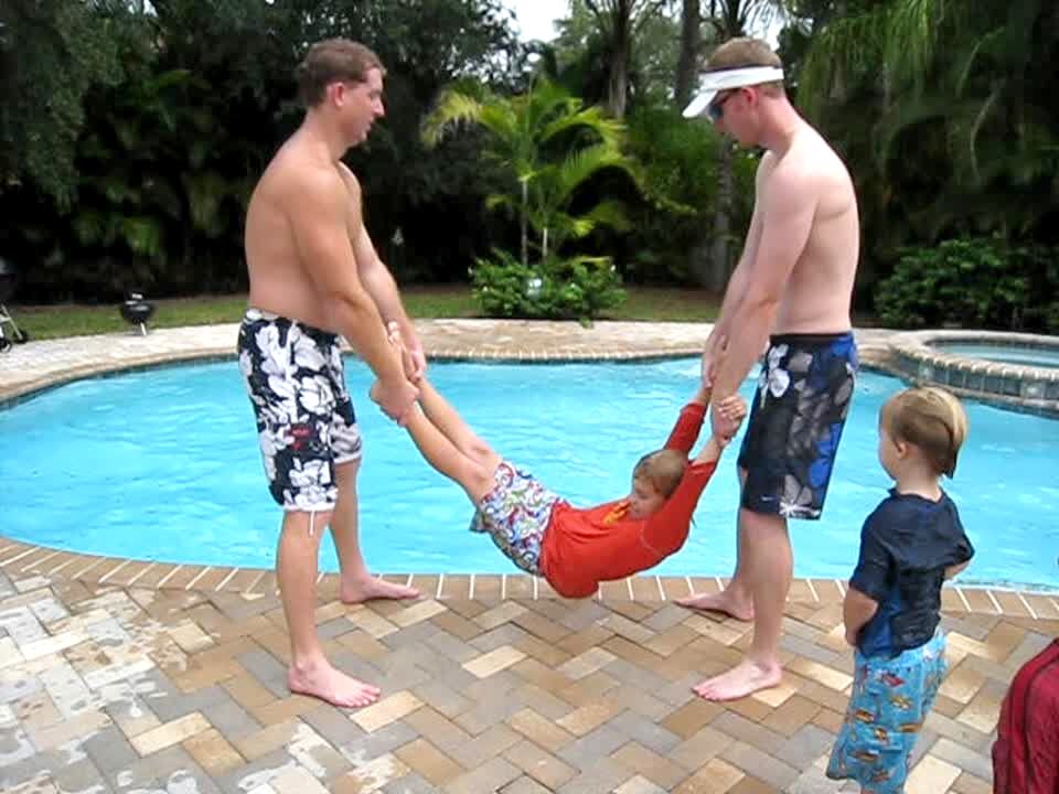 2 men throw boy into the pool by his arms and legs. They swing him back and forth first & knock another boy down when he walks over. No recovery.