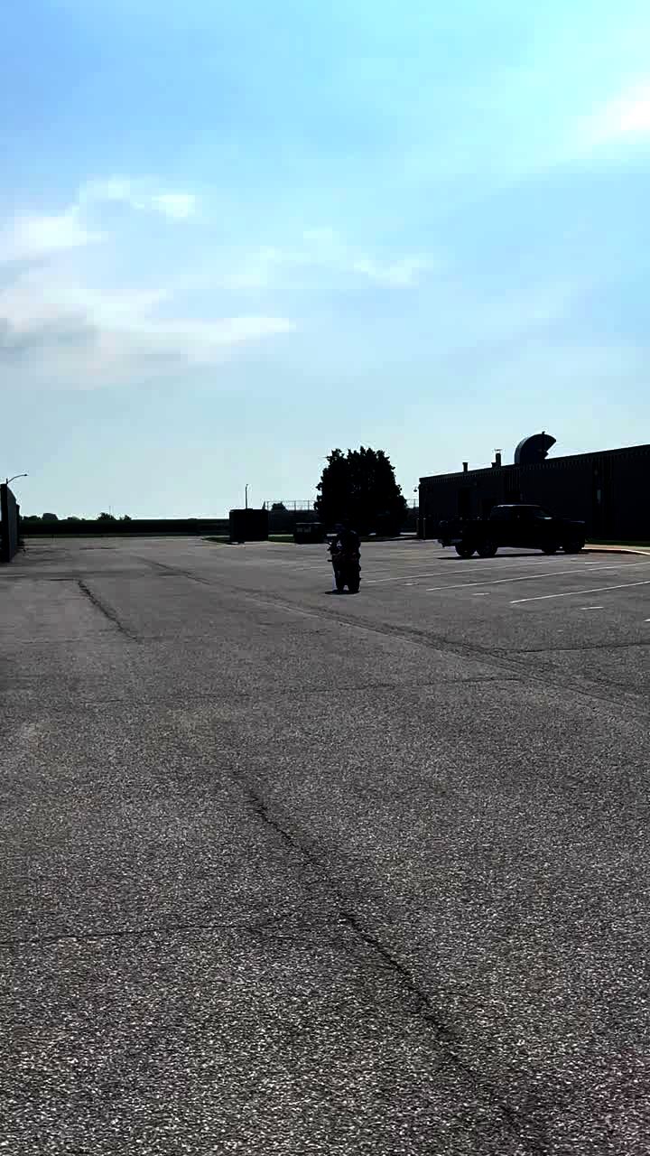 A man rides on a motorcycle in a parking lot. Then he runs into a wall and hits his head.