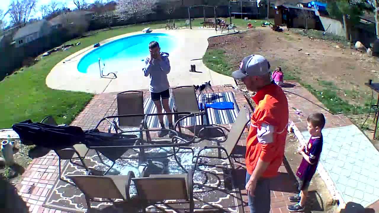 A teen boy tries to put a patio umbrella on a glass table in a yard, but the umbrella falls and breaks the table. Security footage.