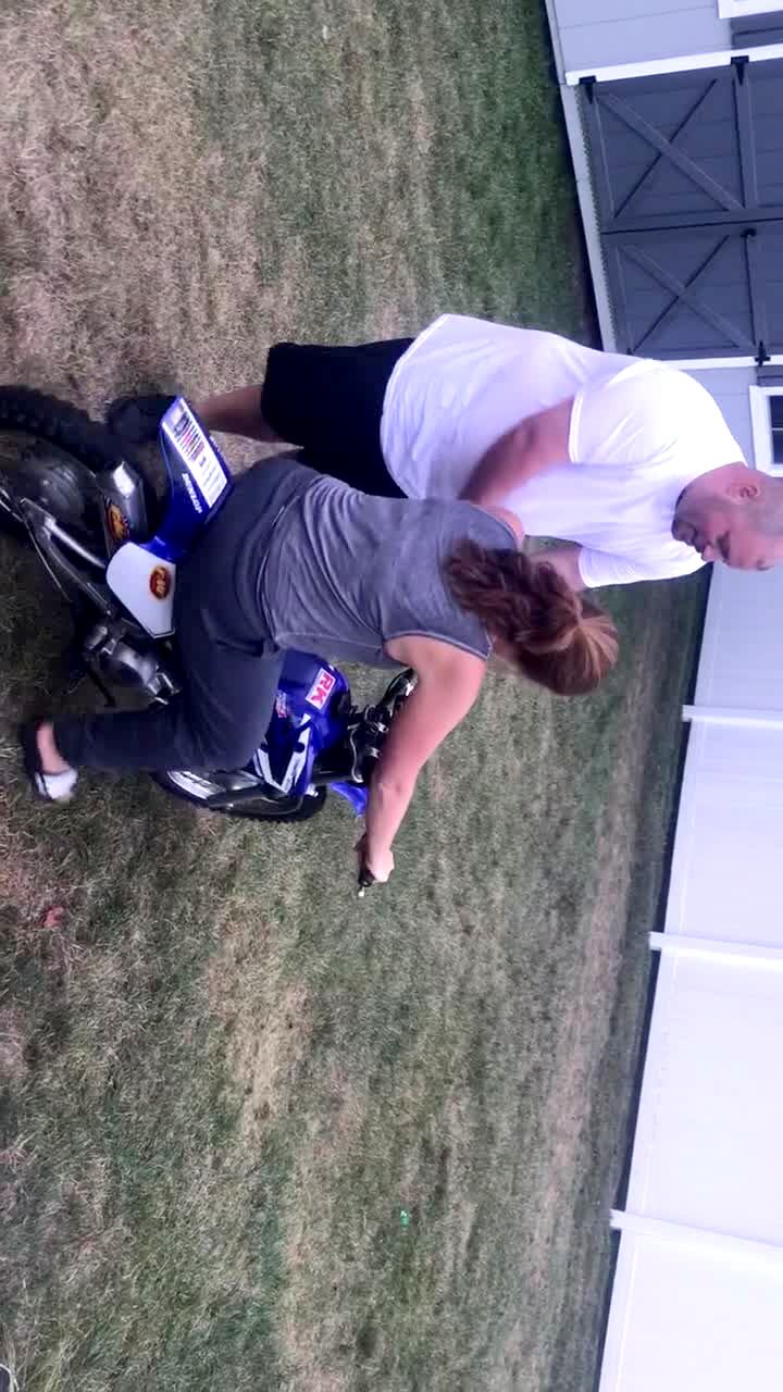 A woman sits on a dirt bike outside and falls off when it moves forward.