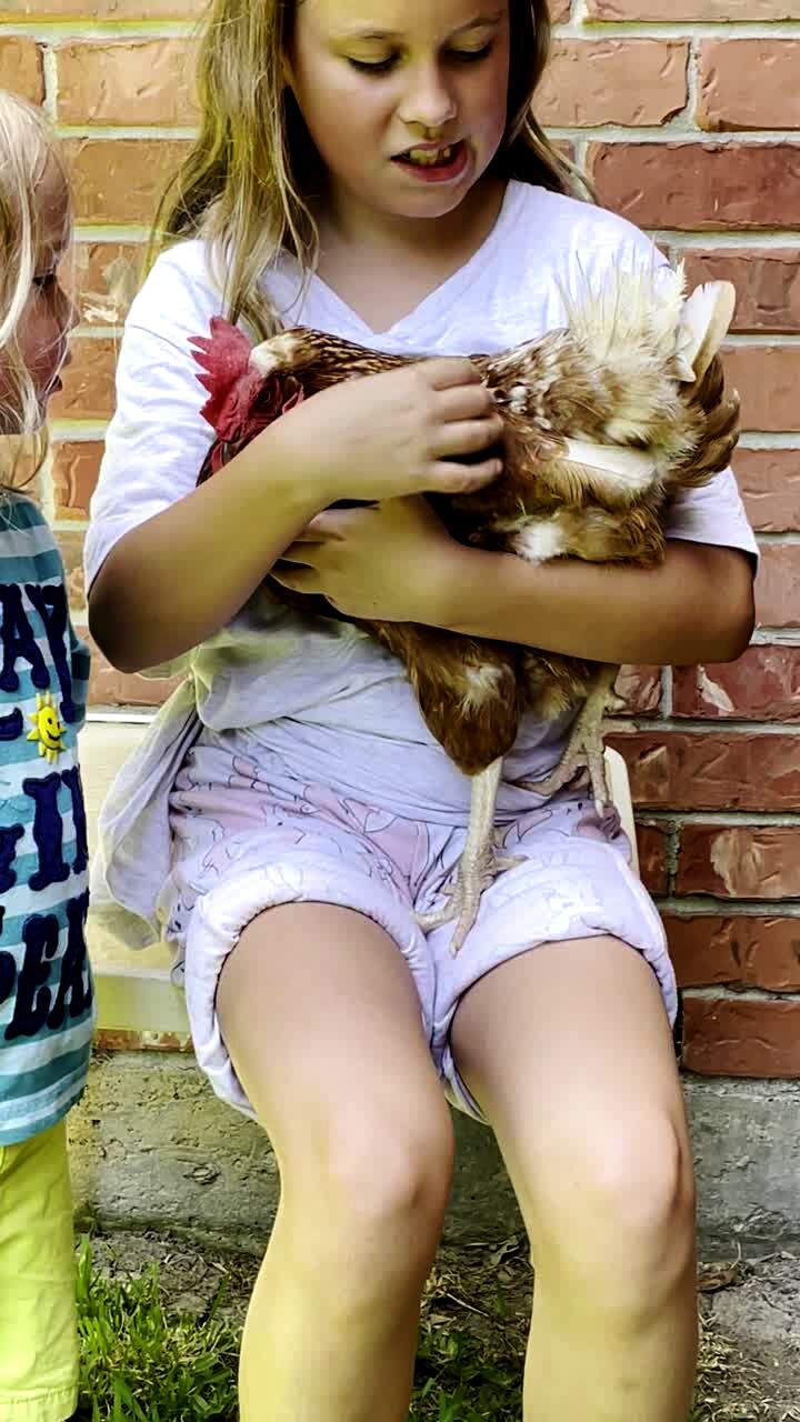 A woman and a young girl walk across an "obstacle course" of toys. The girl steps onto a toy, stumbling and falling backwards onto the patio.