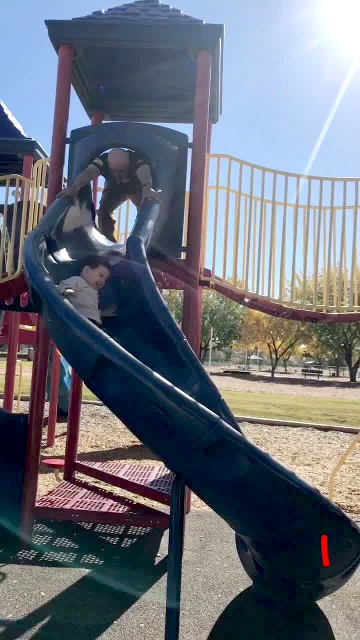 A senior man does a flip when he falls over the side of a spiral slide when he goes down behind his tot grandson.