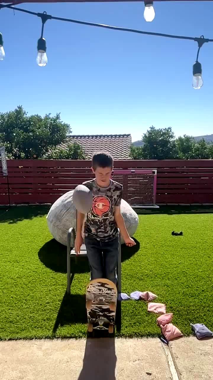 A young boy stands on a chair in the backyard. Then he jumps on a skateboard on the ground with a football on it. The ball hits the boy in the face and he falls.