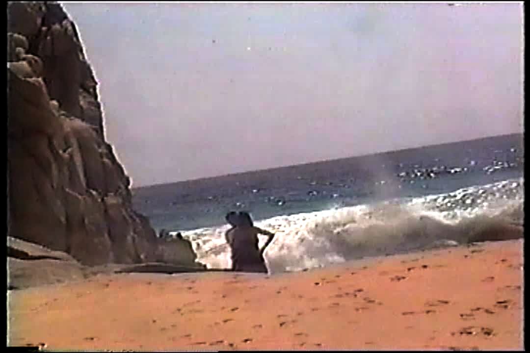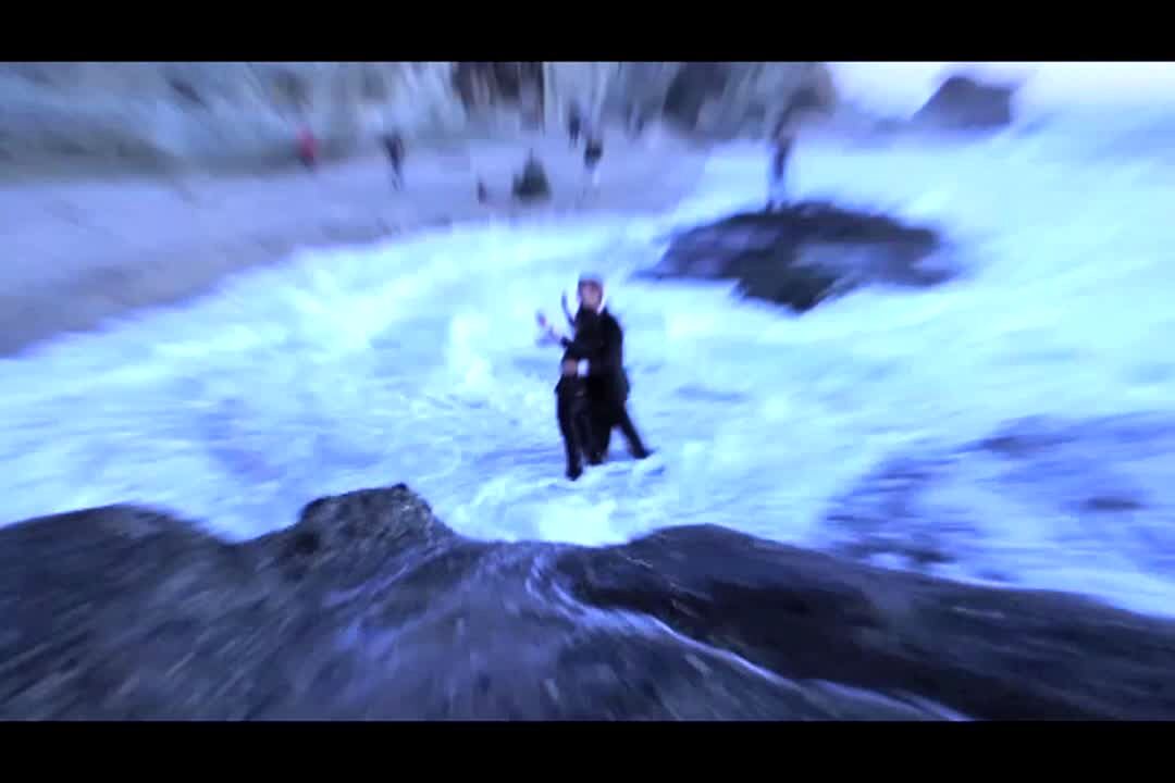 Man tries to propose to woman on a beach while the tide rolls in. Huge wave crashes as they kiss.