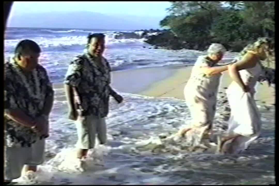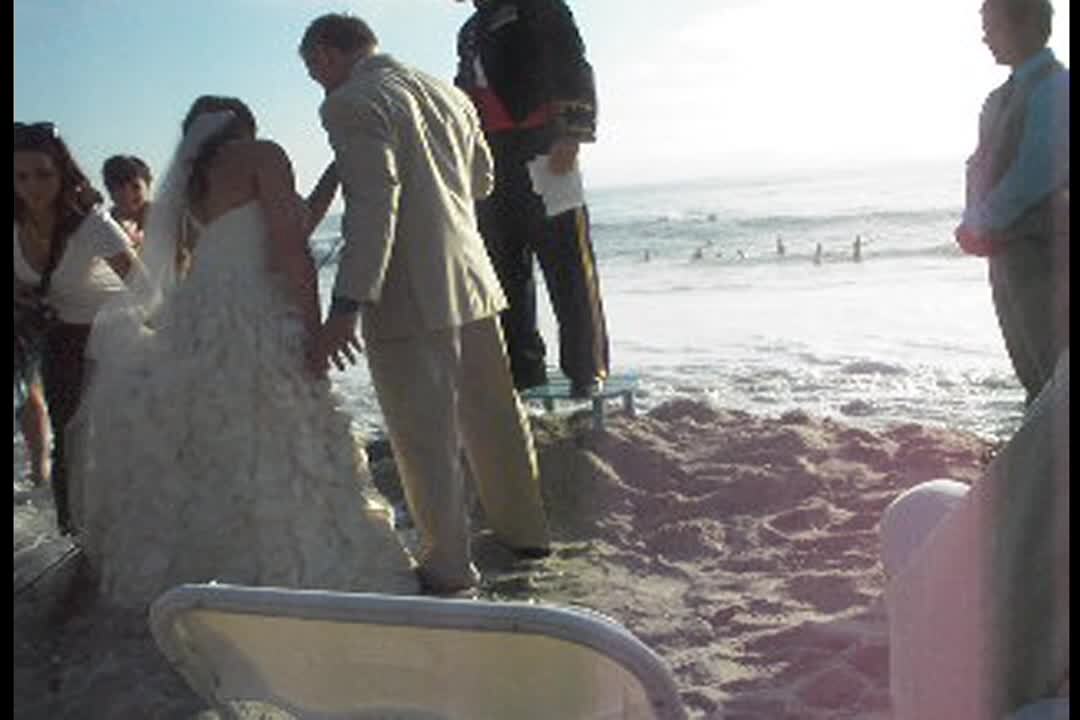 In a romantic beach wedding, a preacher stands on a step stool by the bride and groom when a huge wave rises up and sends the bridesmaids running, drenches the bride and groom's feet, but leaves the preacher dry.