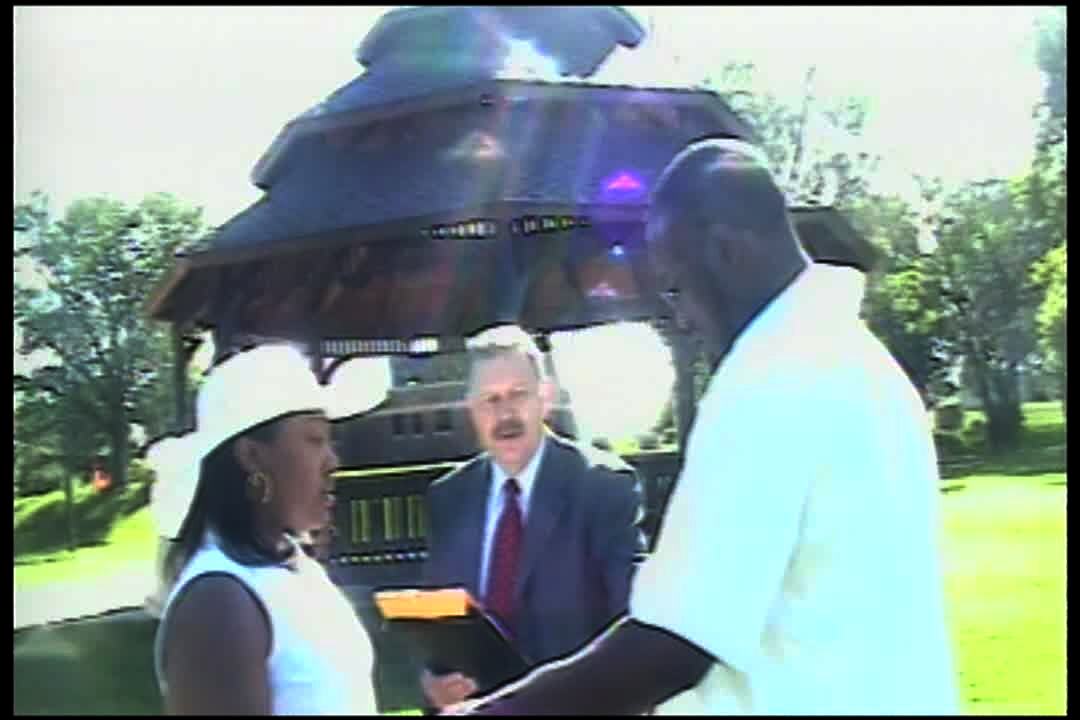 Man & woman get married outdoors, groom starts leaning a bit & almost faints. Man lays down before he falls over completely. Bride has good reaction. Wedding ceremony.