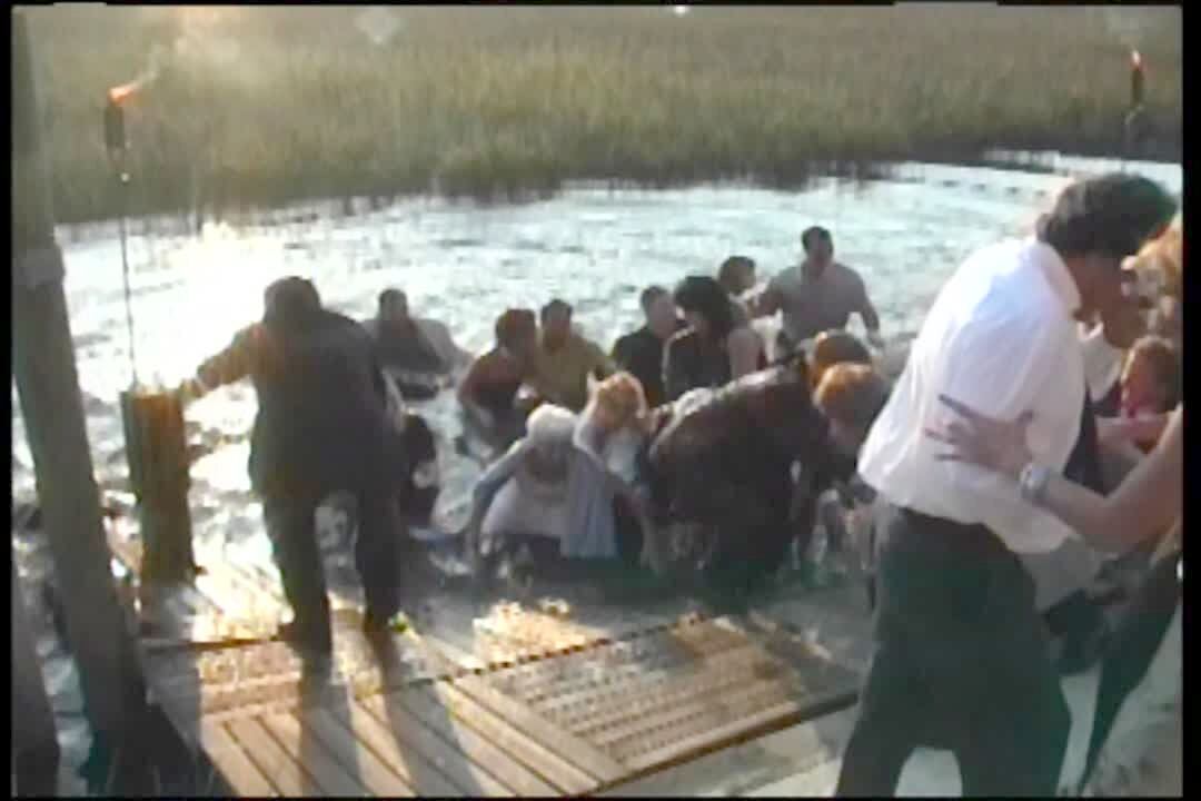 Entire wedding party stands on dock for one last photo, the dock breaks and 30 people end up (fall) in the water.