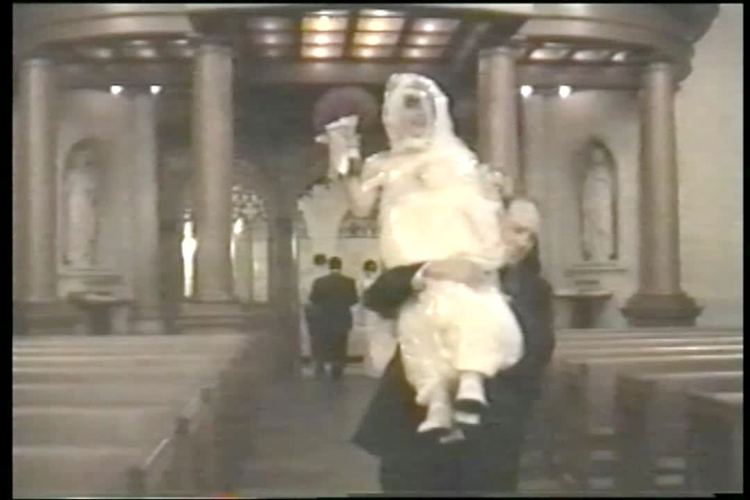Bride & groom are saying vows when a large pillar falls on the bride. She catches it & pushes it up, 2nd pillar falls on groom. Long for edit, good recovery. Wedding ceremony.