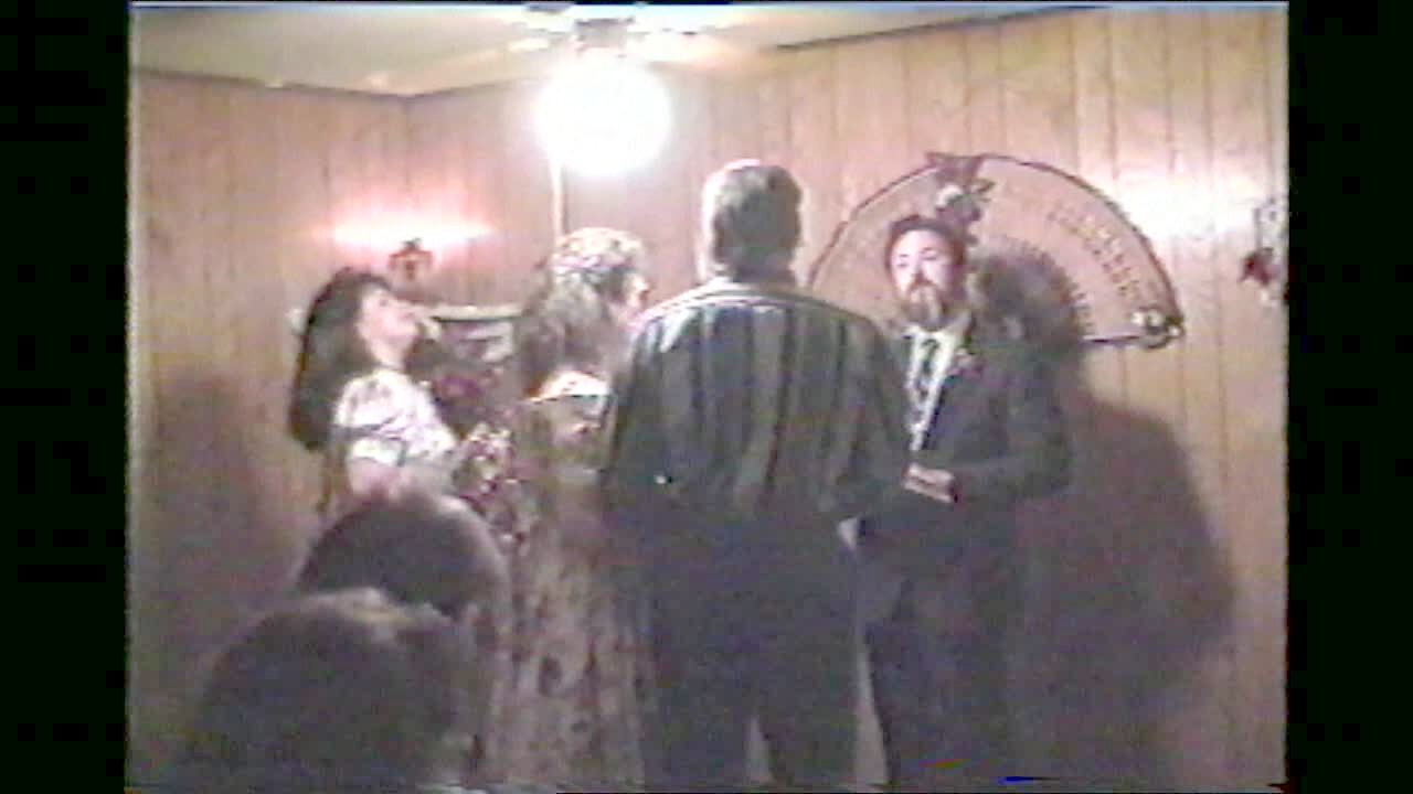 A wedding officiant drops a wedding ring into a lake as he stands with the bride and groom on a rock. The officiant and the groom hold a man's legs as he retrieves the ring from a rock below and the guests cheer. All talent cleared except the woman in the snow cap shown at the end.