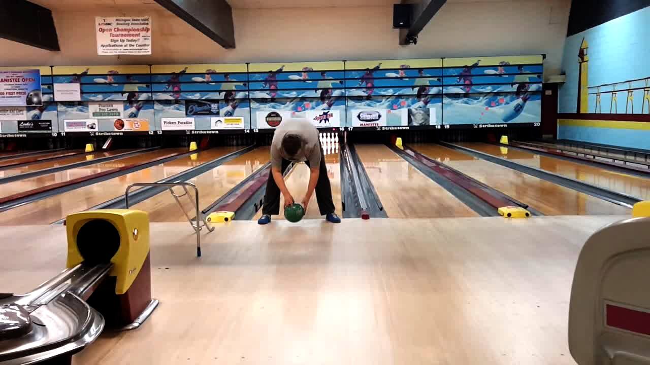 A teen boy rolls a bowling ball backwards and through his legs and gets a strike.