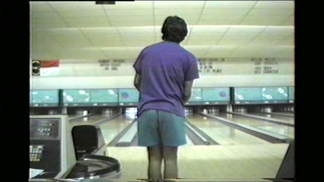 A teen girl runs and bowls a bowling ball down a lane at a bowling alley and accidentally steps onto the lane. She slips and almost falls, but catches herself, but then she slips again and falls.