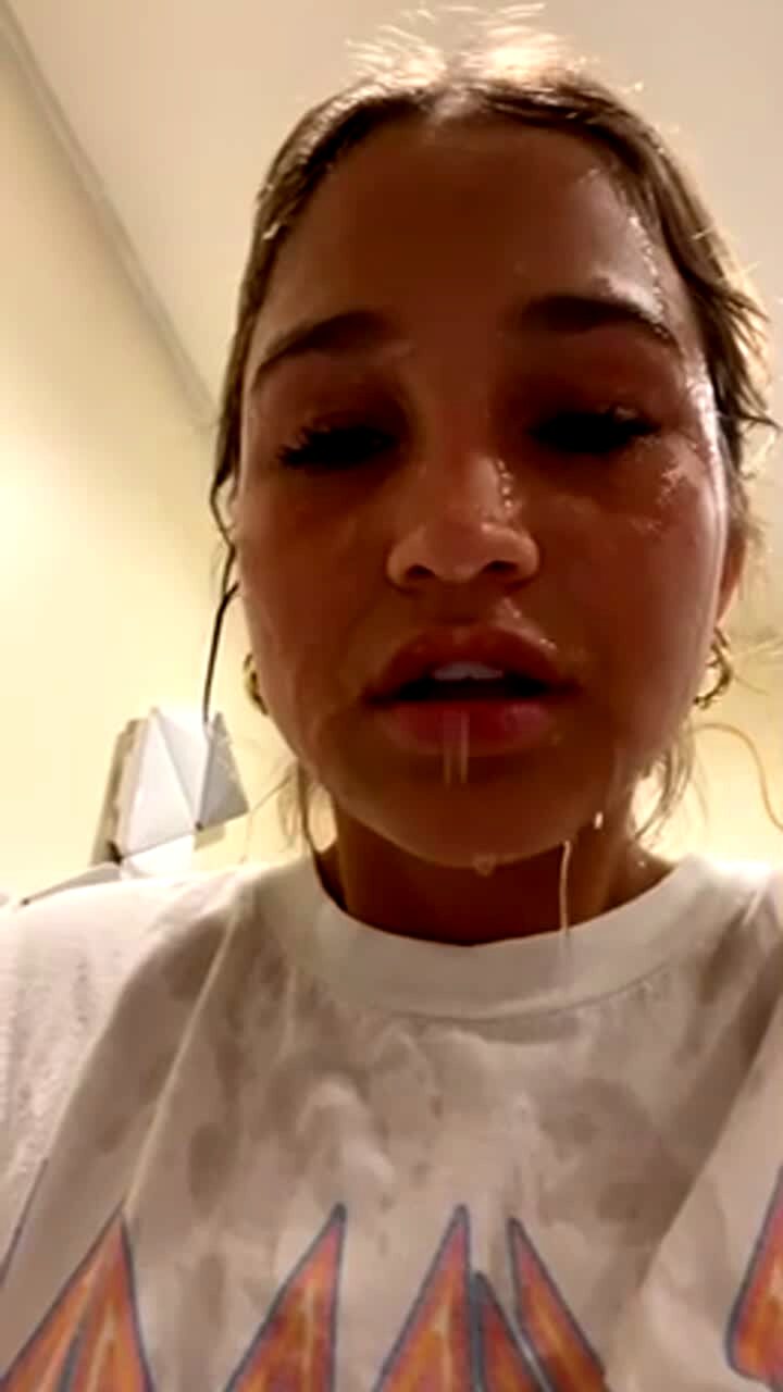 A teen girl talks to the camera and chews on a water bottle and she lays in a bed and water spills all over her face in the bedroom.