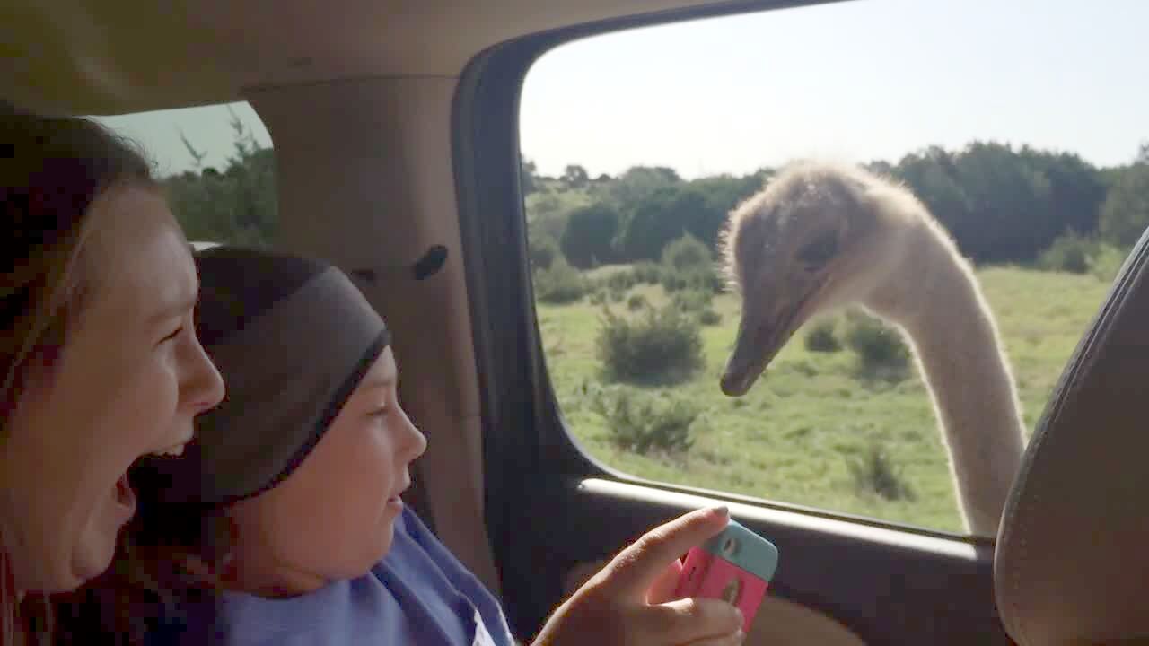 An ostrich bird knocks a woman's phone out of her hands when she films it at a drive-thru safari-park. Her young girl screams and looks down at the phone as it continues to record on the ground outside of the car. The woman hesitates he grab the phone and the ostrich looks into the camera and pecks at it.