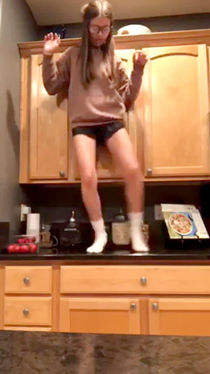 A teen girl dances on the counter, and when he tries to get down she slips and her shorts catch on a cabinet door giving her a wedgie. The door flies open and she hangs in the air for several painful seconds.