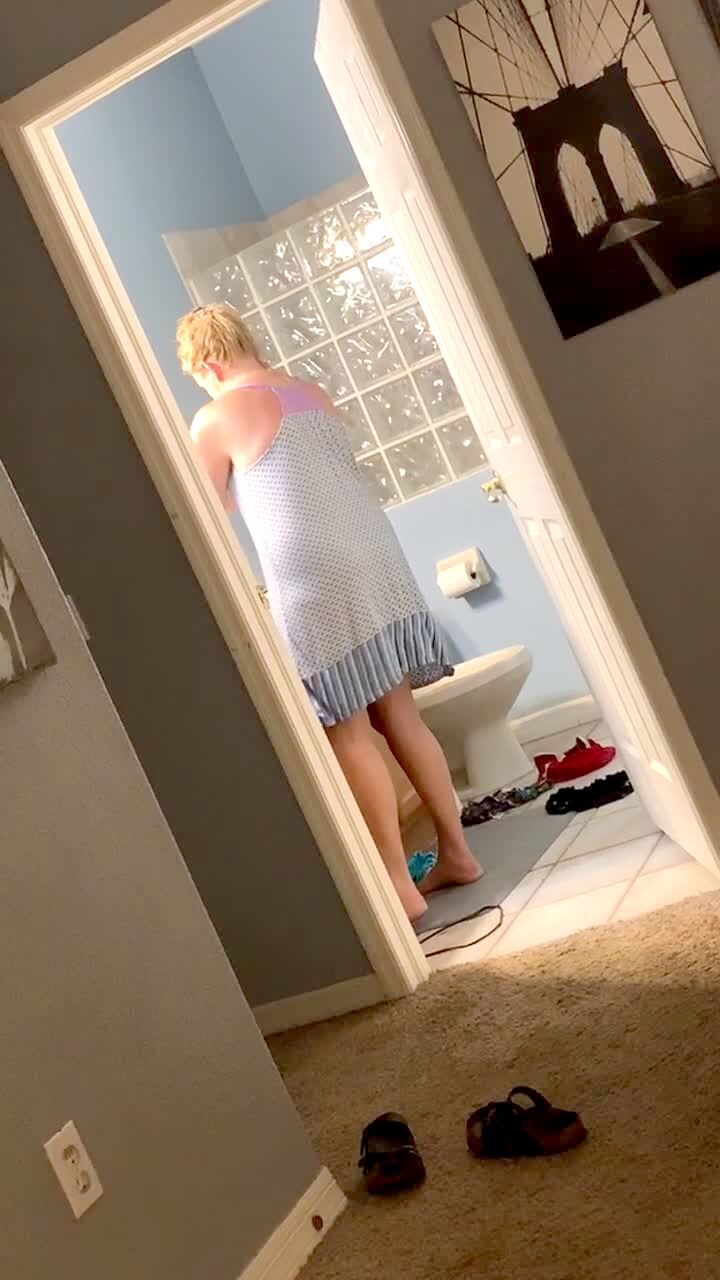 A woman screams when she walks out of the bathroom and her teen daughter says hello.
