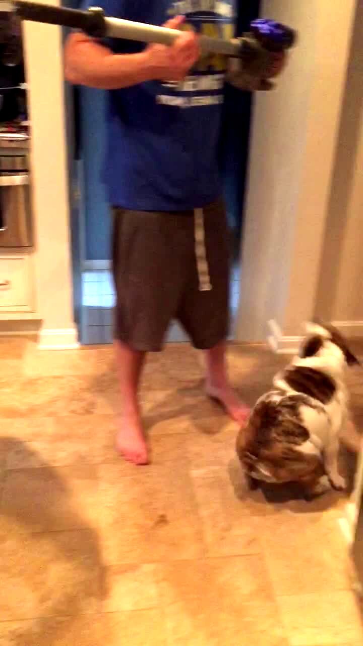 "Bear-ly Able to Escape" A bear in the driveway rips open the garbage bag. A man hits two pans together to try to scare it away but it charges at him so the whole family runs away. Security Footage.
