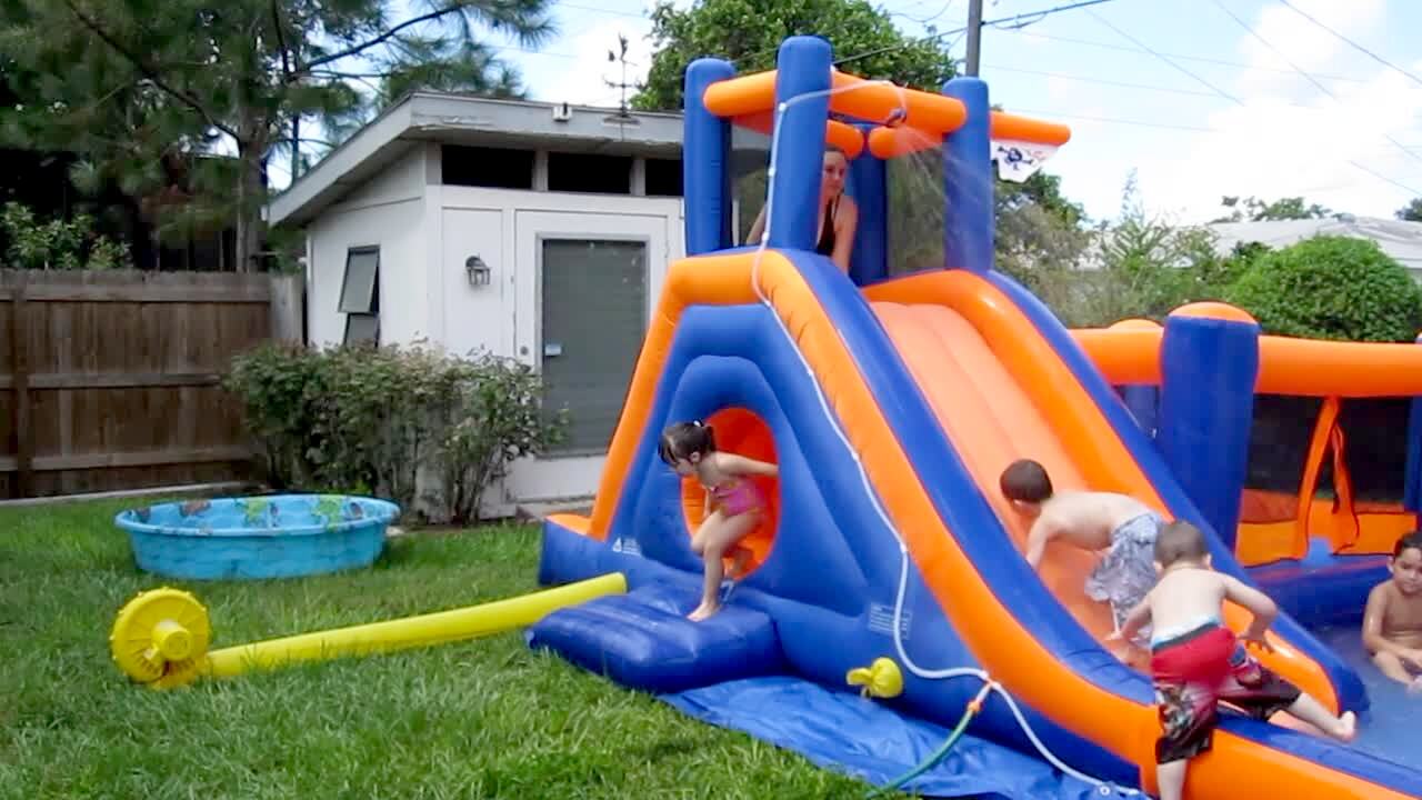 Grandma / senior woman climbs up inflatable backyard water slide. She falls down the slide instead of sliding down it.