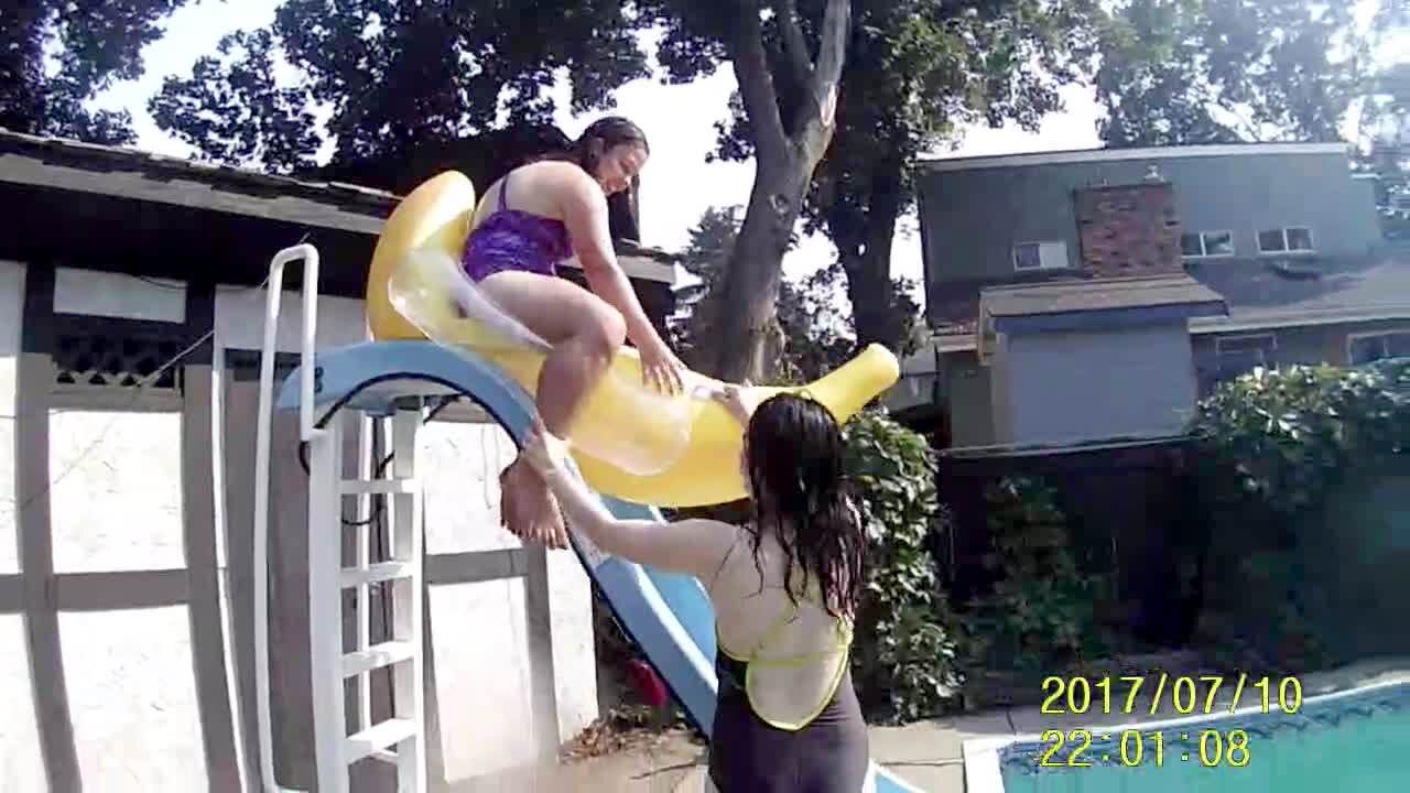 A woman climbs onto a small toy slide to slide into a swimming pool. The slide collapses beneath her and she falls to the ground.