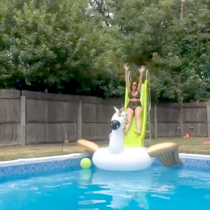 A woman puts an inflatable pool float on a tarp and tries to slide it down a hill, but she falls off the float and slides down on her stomach. Music rights not cleared.