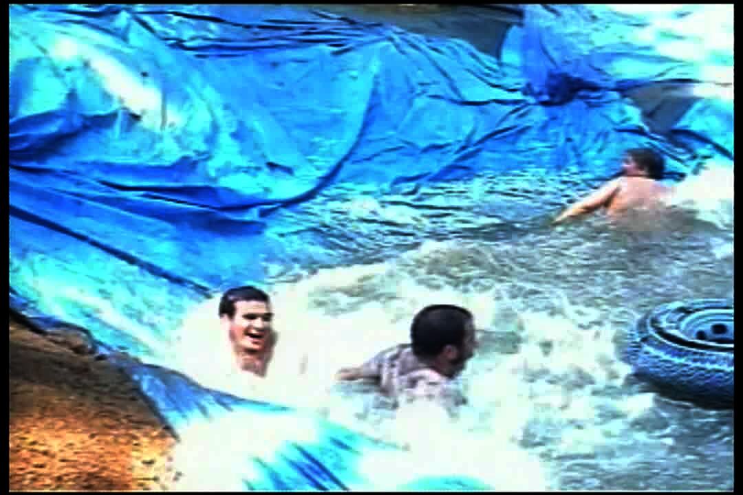 Woman goes down a large homemade water slide so fast she slides all the way through the landing area into some mud. With recovery.