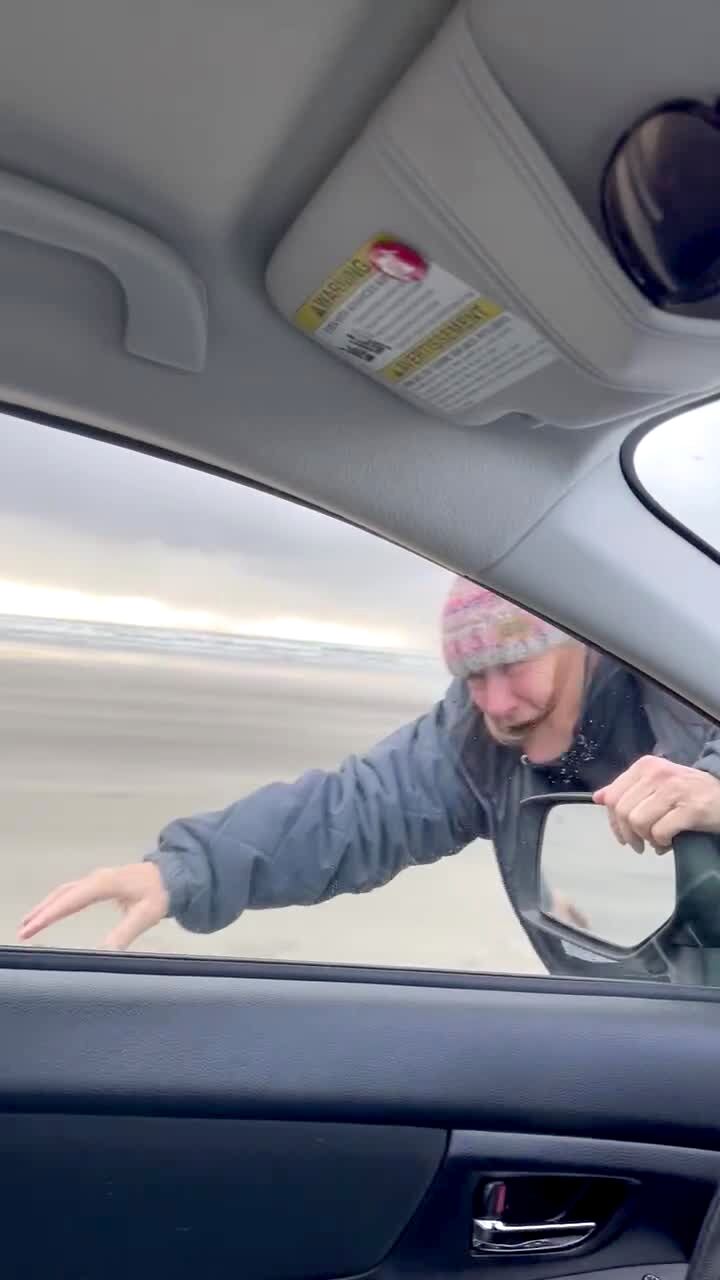 A woman struggles to get into a parked car in heavy wind at the beach. She is repeatedly blown back by the wind.