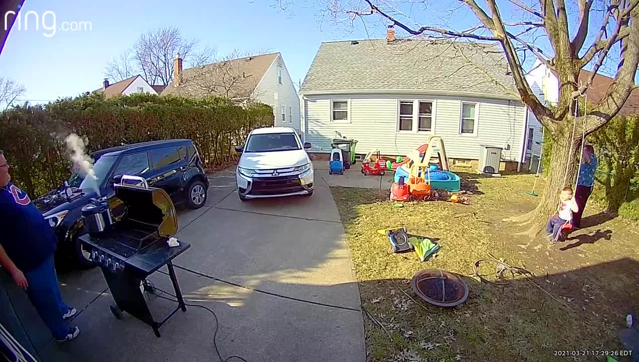 "Squirrel Swipes Sandwich" A squirrel eats a hamburger on a porch while a woman and a cat watch, and the woman says that she had ordered food delivery and the squirrel got there first.