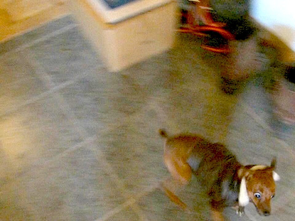 A Golden Retriever dog licks a pan, then his collar gets stuck in it and it makes a loud clatter sound as he runs out of a kitchen. Security camera footage.