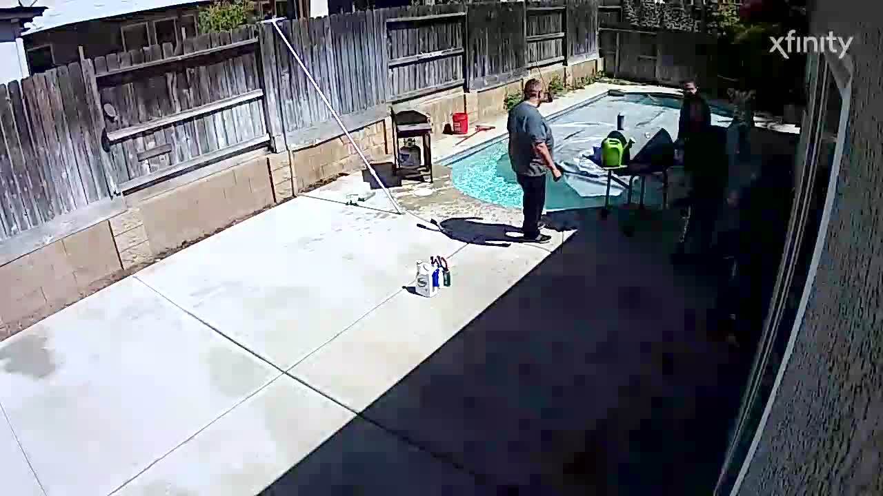 A man sweeps in the yard and falls backwards into the swimming pool. Security footage.