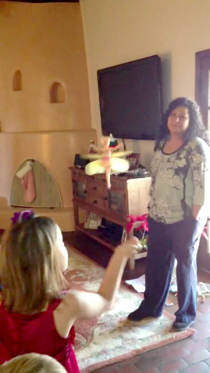 A man, his wife, boy, and girl play with a flying fairy toy for Christmas. Before they can figure out how to control the toy, it flies right into the camera.