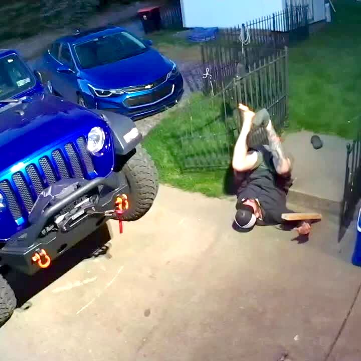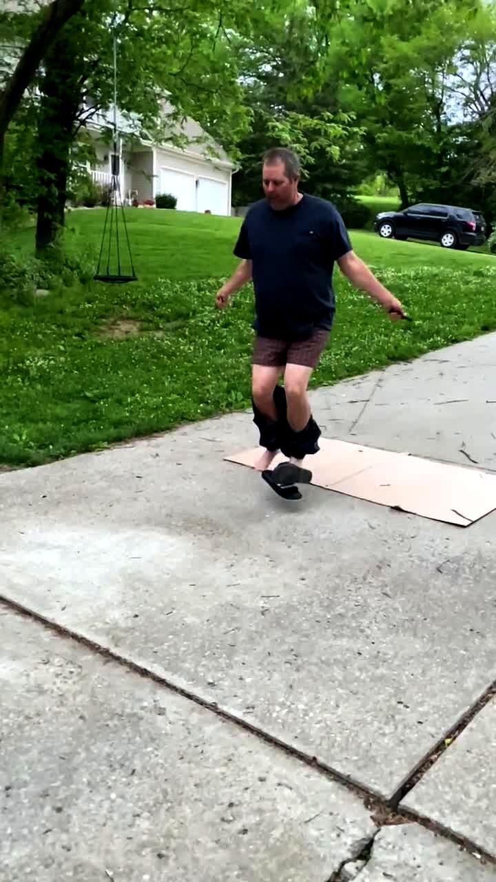 A young boy tells his father "I got better balance than you," then the man rides a skateboard and falls down on the driveway. Security footage.