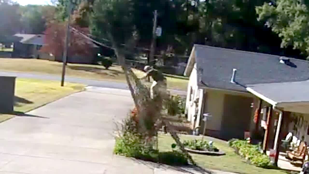A man on a ladder pulls on a cut tree branch to remove it in his front yard, then he jumps off of his ladder, stumbles, and falls down. Security footage.
