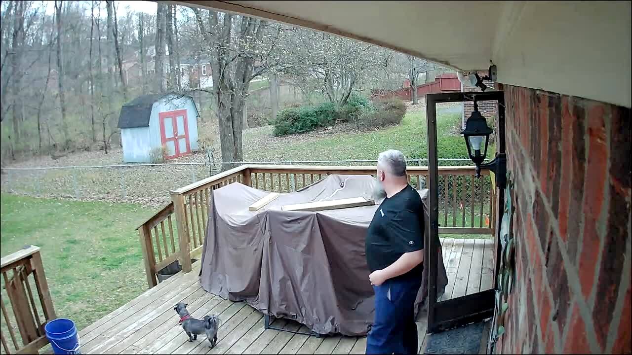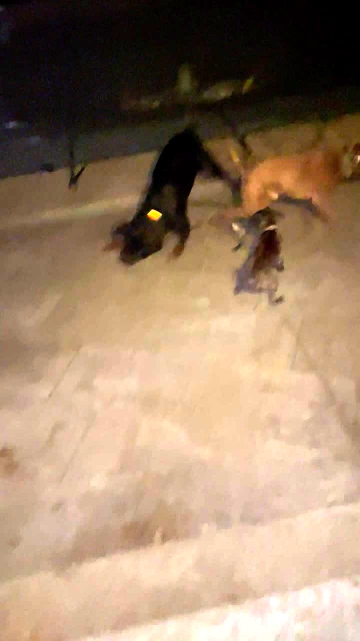 Three dogs slip and slide down the same icy patio steps as they go out to potty.