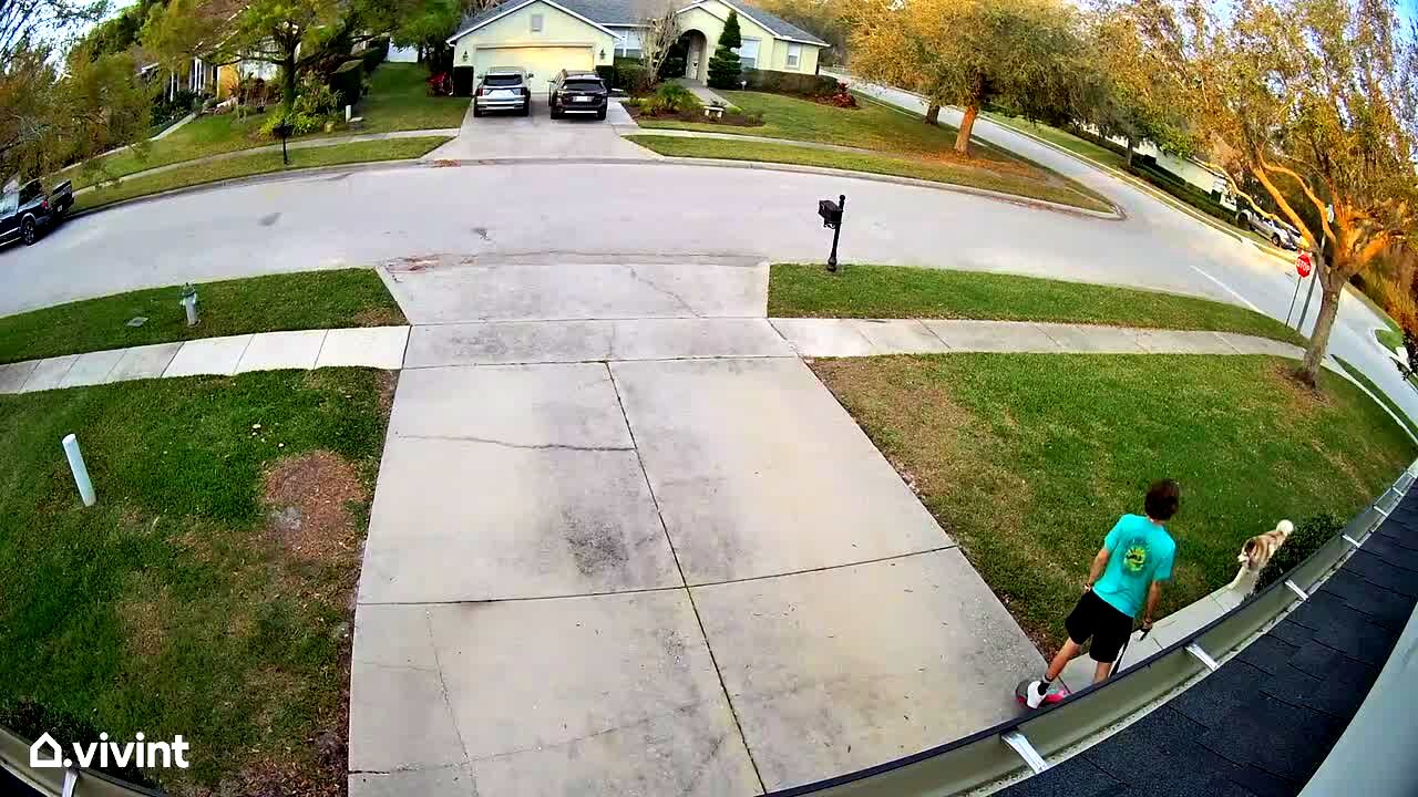 A man wipes out on a OneWheel in a driveway while he takes a Husky out for a walk. Security footage.