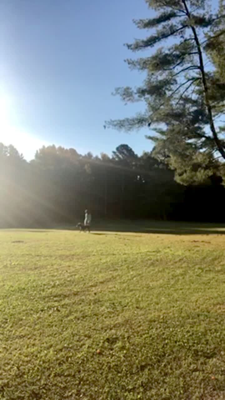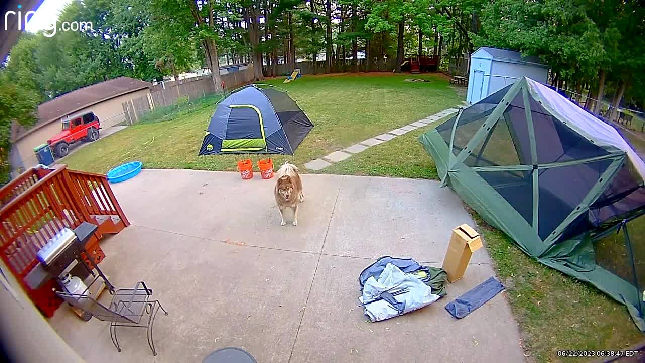 A dog runs into a mesh camping tent and knocks it over onto its side. Security footage.