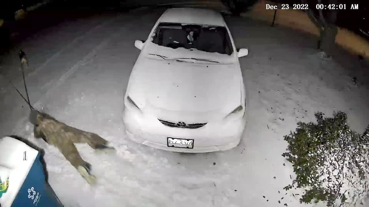 A man leaves the house with two dogs, but the dogs both run and pull him down in the snow. Security footage.