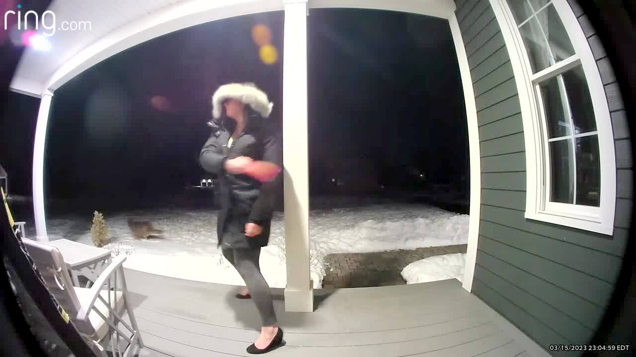 A woman throws a Frisbee toy off of a porch for her dogs, then she screams and falls into snow in the yard. Security footage.
