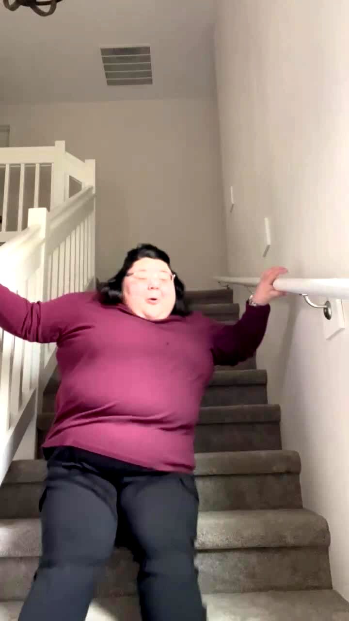 A woman yells "go" and starts to race her Labrador retriever and terrier down a flight of stairs but she trips and falls, breaking the railing off of the wall.
