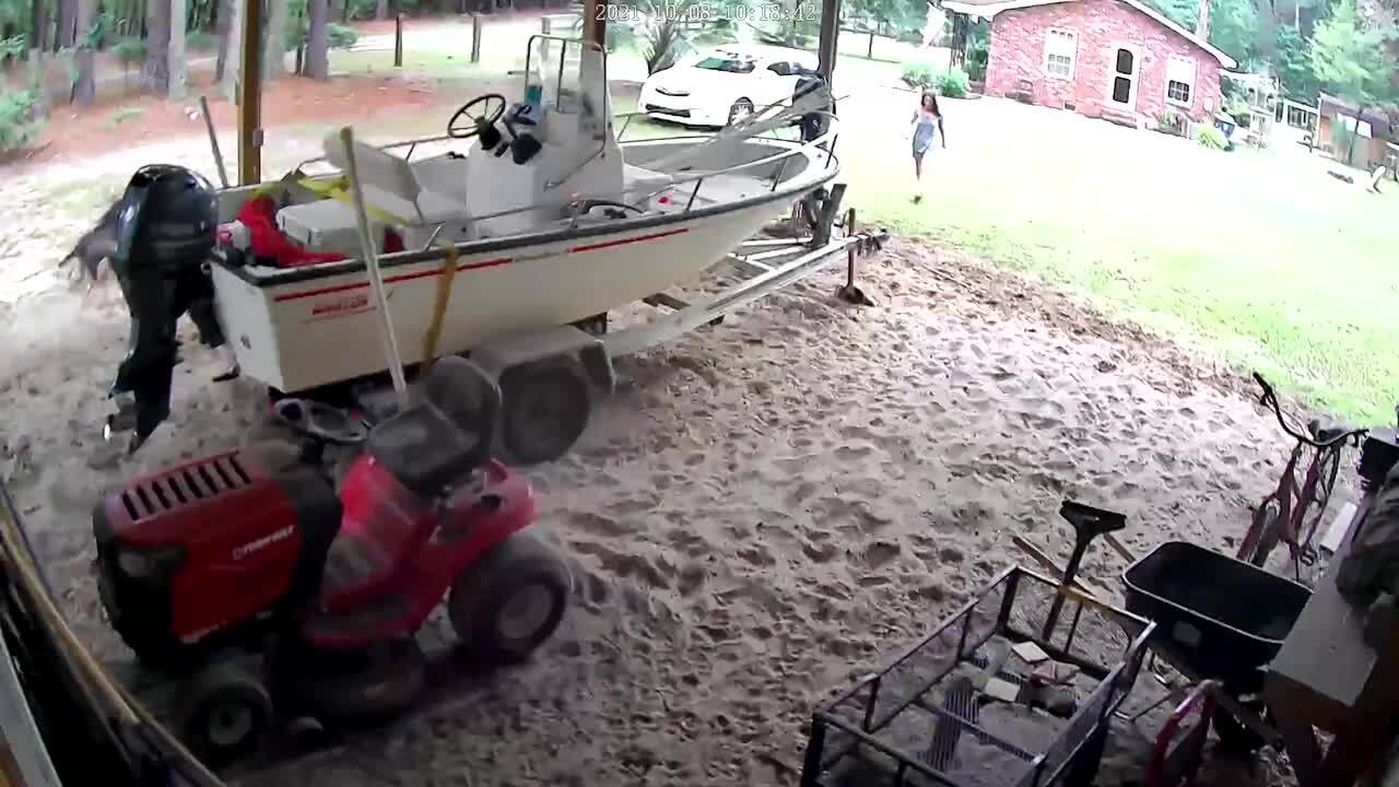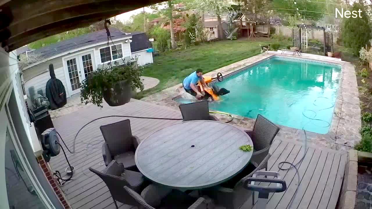 A man mows the lawn on a riding mower and accidentally drives backward into his inground swimming pool. Security footage.