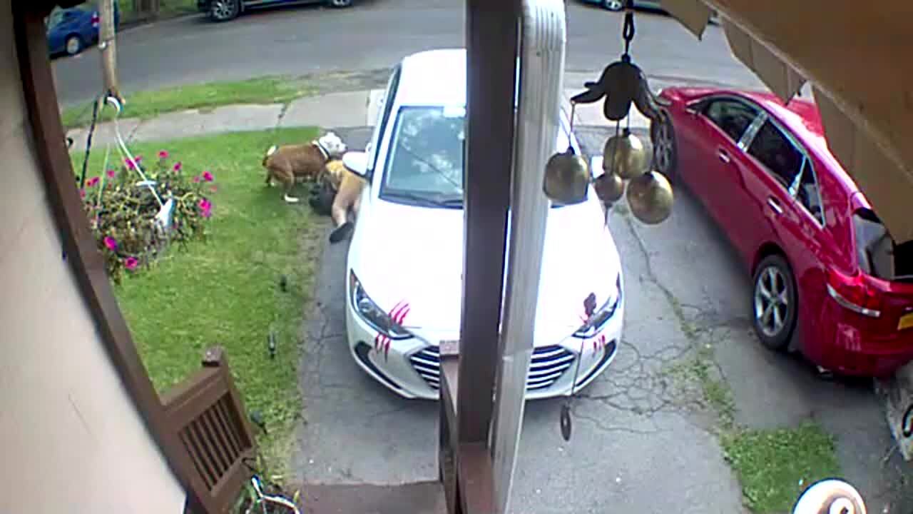 Two dogs bark and chase each other when a woman walks out to check on them and one of them runs into her, sweeping her off her feet. Security footage.