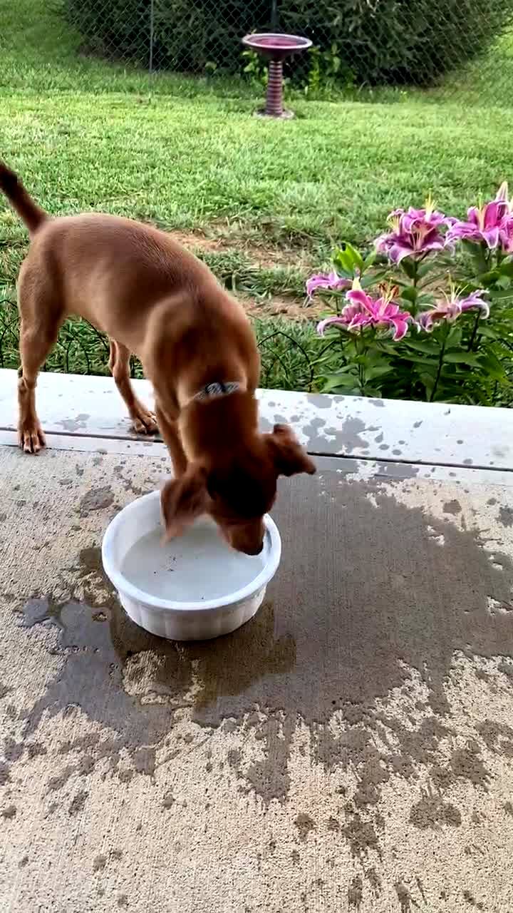 A dog paws at a water bowl and splashes it all over a patio and then falls off the patio.