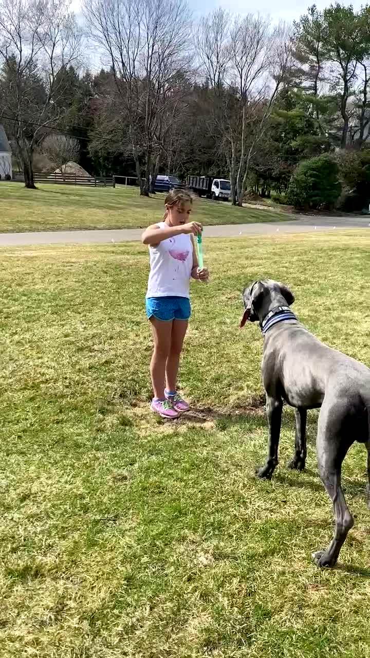 A young girl blows bubbles for a Great Dane puppy in the front yard, and he jumps up to knock her over.