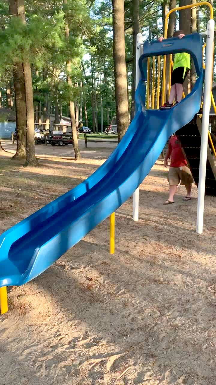 A young boy slides down a playground slide. a dog slides after him and knocks him over.