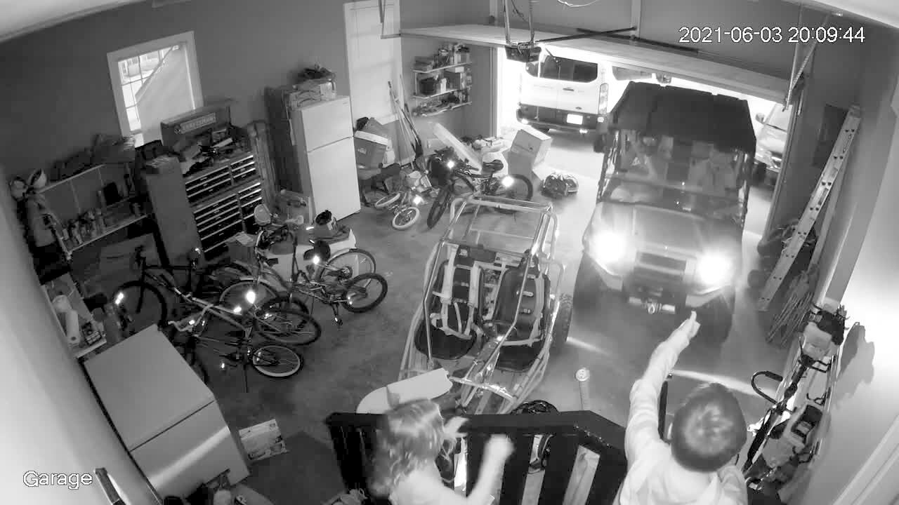 Two young boys and a young girl watch a woman pull a vehicle into a garage, but she hits the garage door and a nearby dune buggy. One young boy gives her a thumbs up and yells "great job." Security footage.