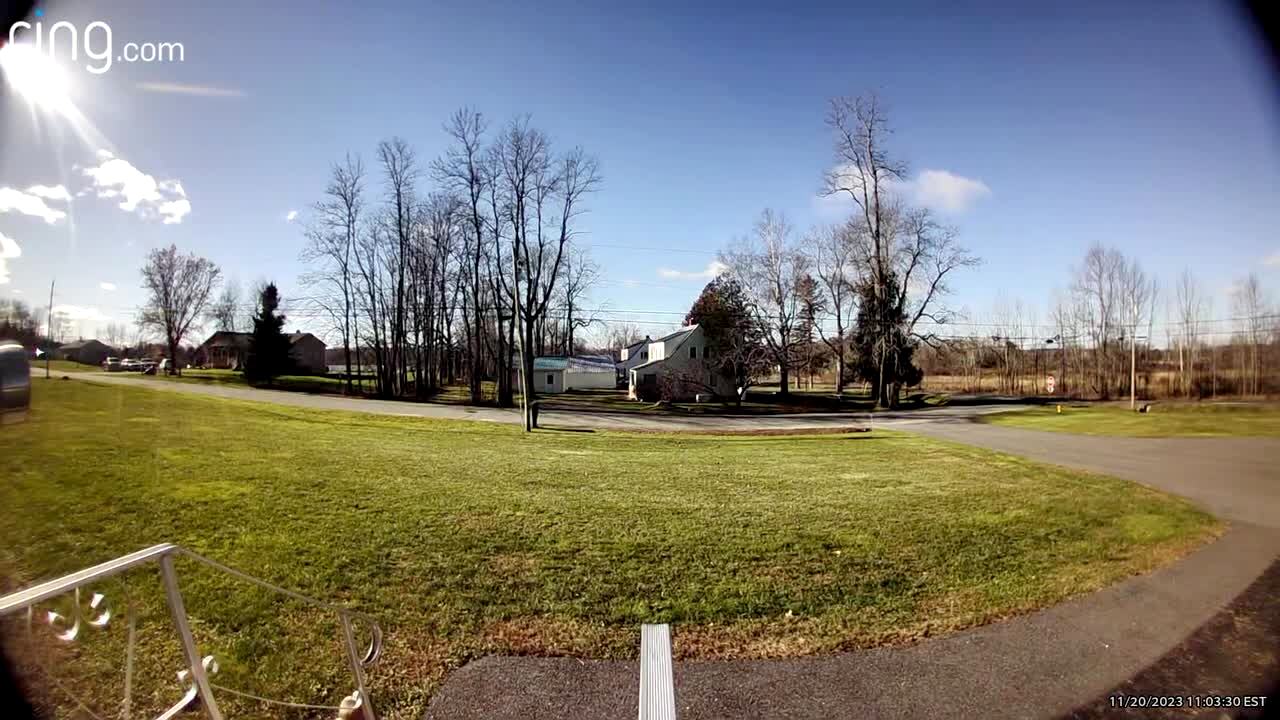A young boy gets swung and flung onto the yard, as he tries to exit a front porch door. Security footage.