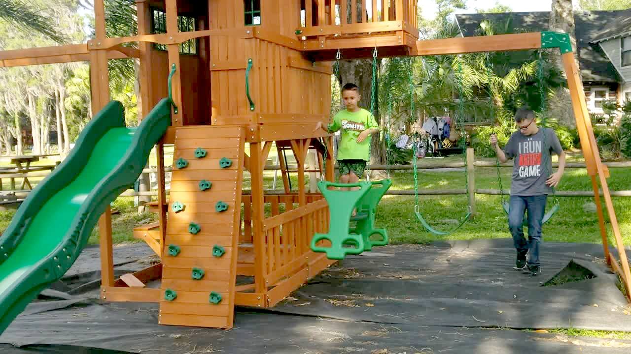 A young man lists off some safety tips before he zip lines in a yard, then the rope breaks, and he falls down.